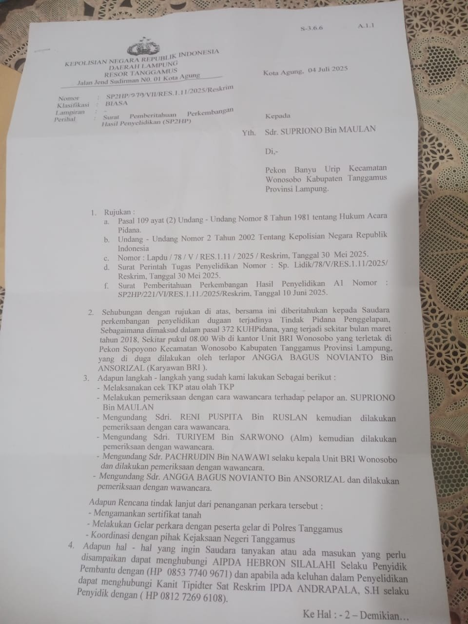 Tanggamus-Unit Tipidter Sat Reskrim Polres Tanggamus berikan Surat Pemberitahuan Perkembangan Hasil Penyelidikan (SP2HP) ke supriono terkait kasus BRI Unit Wonosobo. Selasa, 08 Juli 2025.
